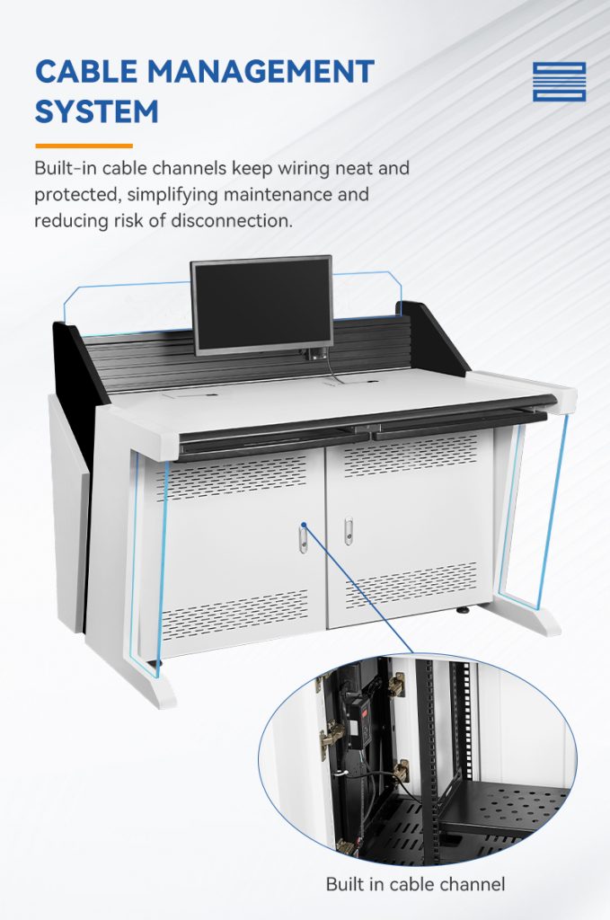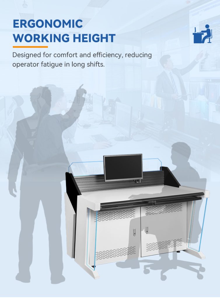 - Ergonomic Command Design: The Control Room Console features adjustable worksurfaces and built-in cable management for extended operation comfort.