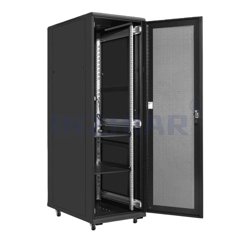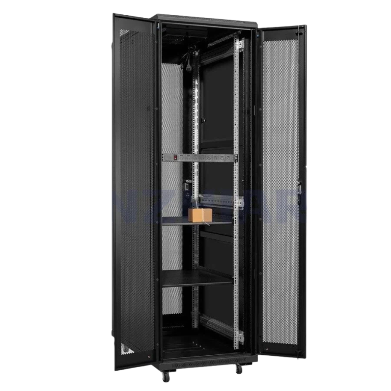- Network cabinet with adjustable mounting rails (multi-position slots) to adapt to equipment depths