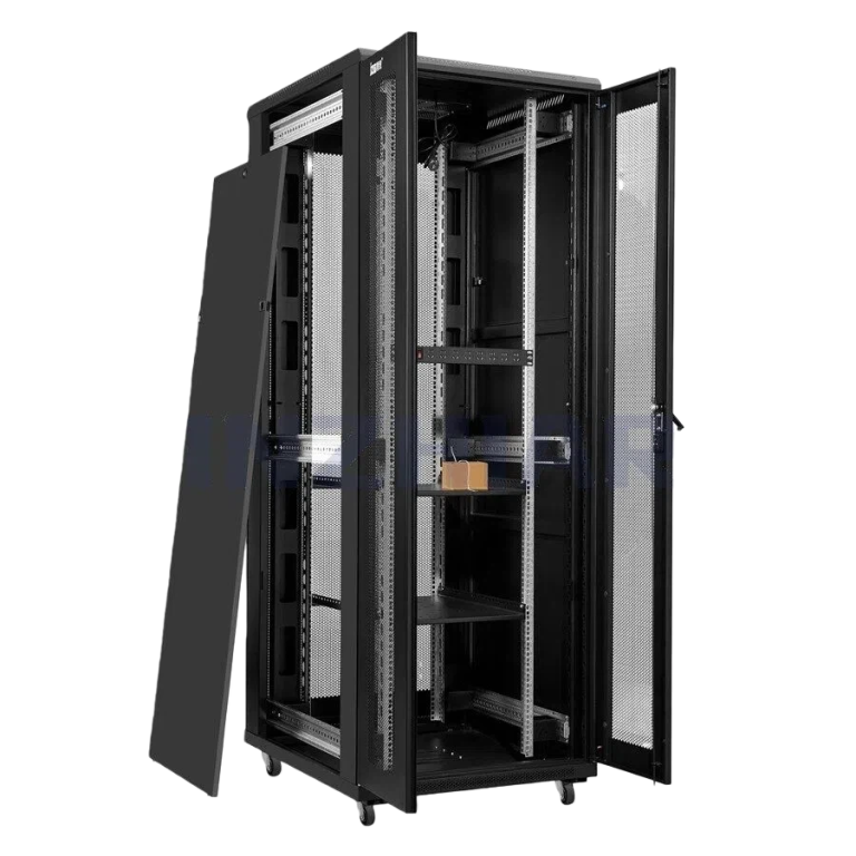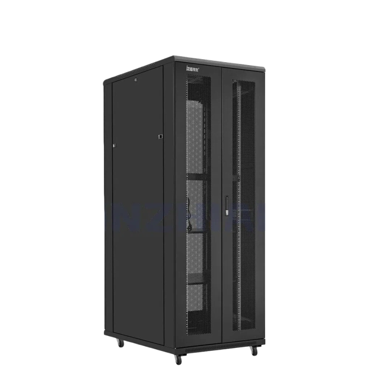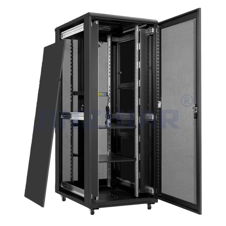 - Network cabinet with adjustable mounting rails (multi-position slots) to adapt to equipment depths