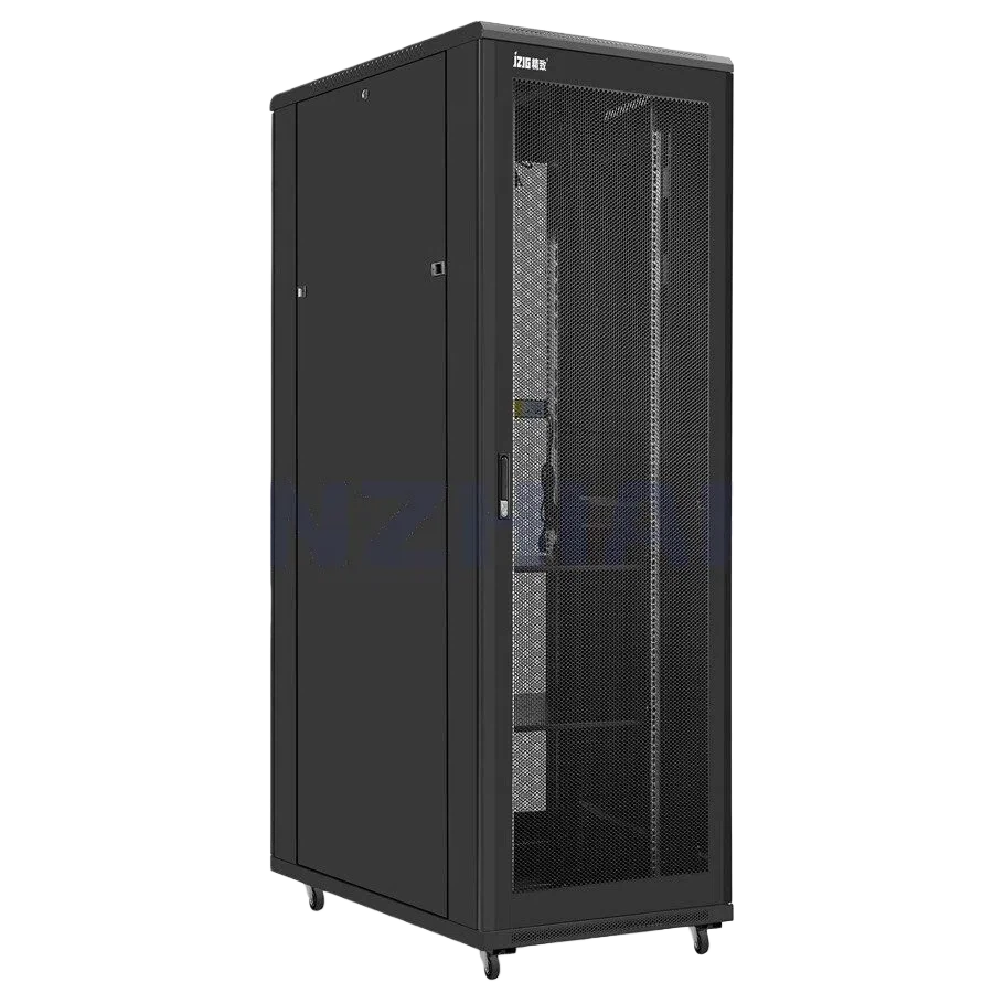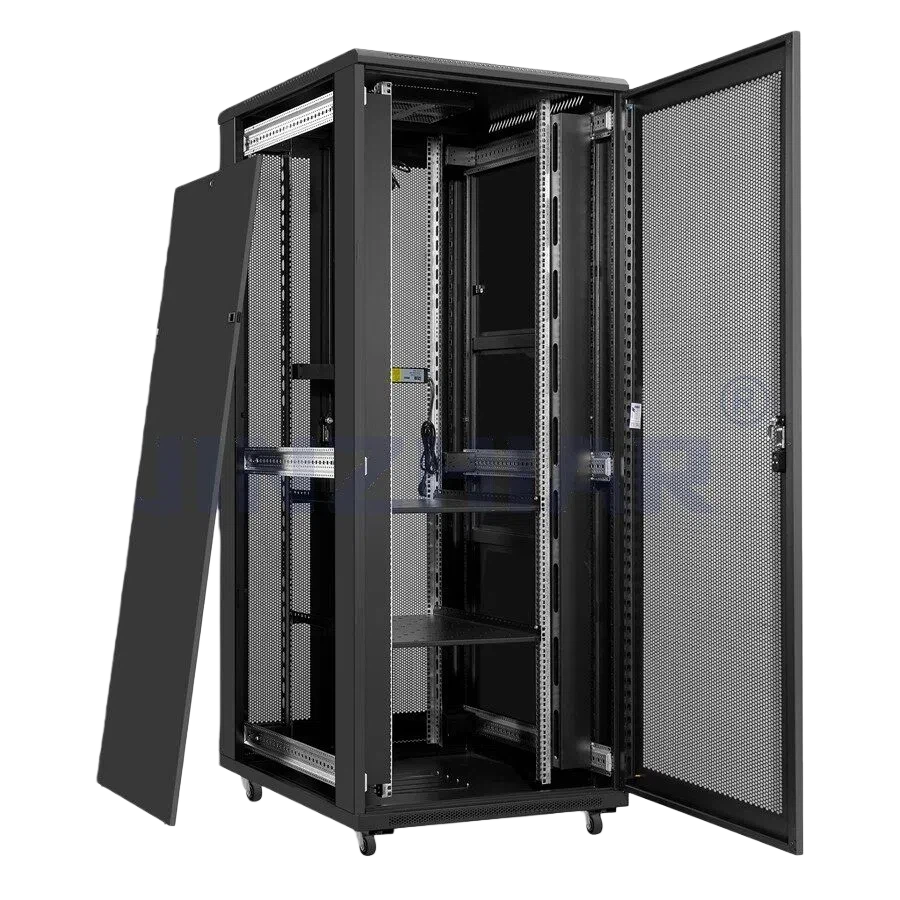 - Network cabinet with adjustable mounting rails (multi-position slots) to adapt to equipment depths