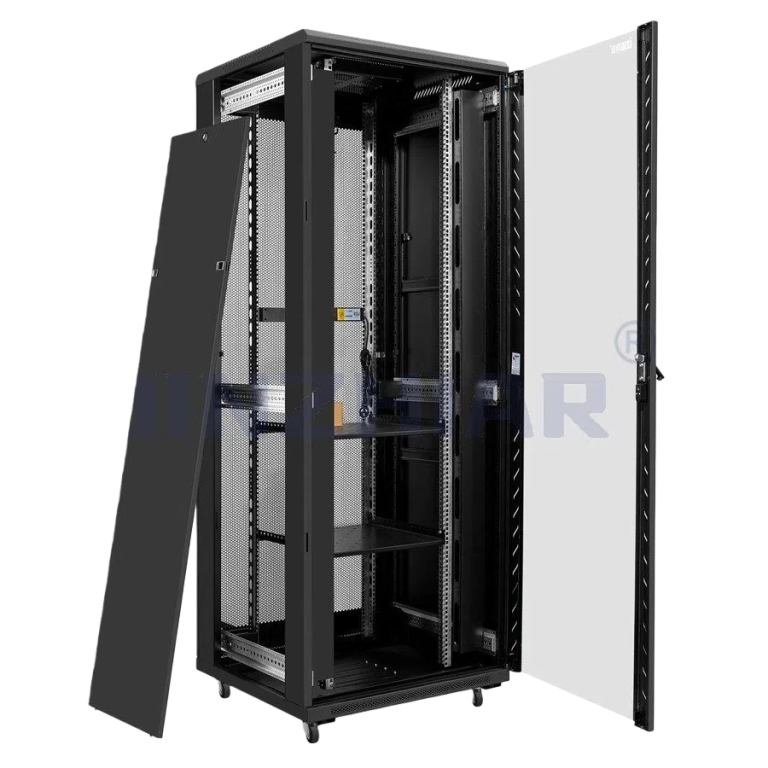 - Network cabinet with top/bottom cable entry holes + grounding studs for flexible, safe wiring