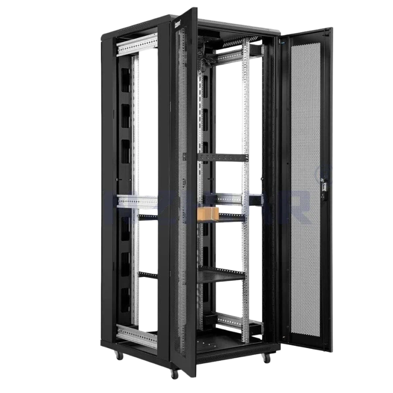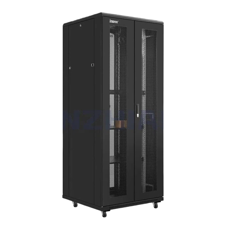 - Network cabinet with adjustable mounting rails (multi-position slots) to adapt to equipment depths