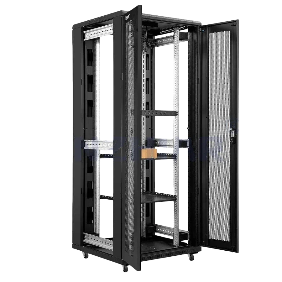 - Network cabinet with adjustable mounting rails (multi-position slots) to adapt to equipment depths
