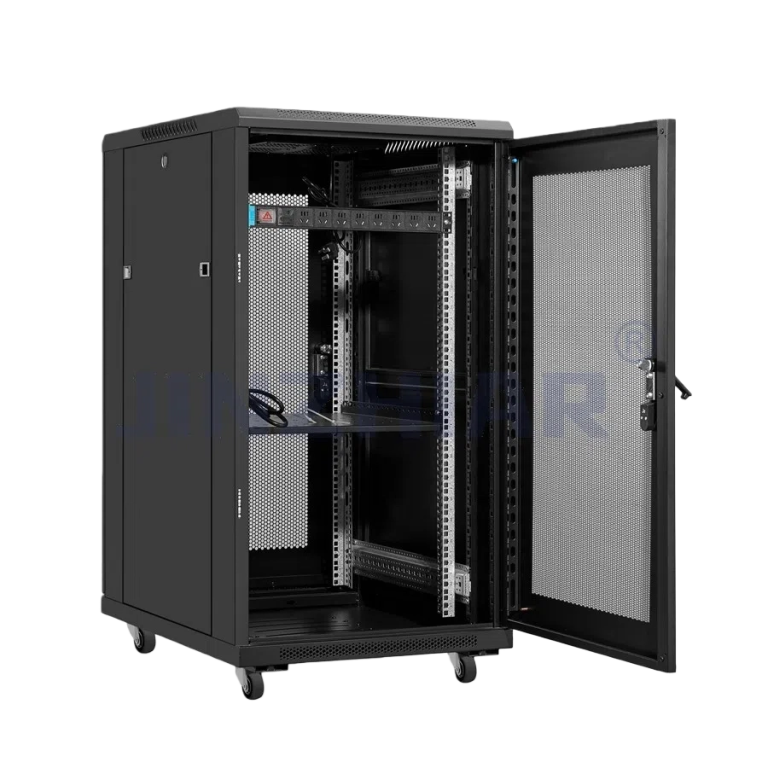 - Network cabinet with adjustable mounting rails (multi-position slots) to adapt to equipment depths