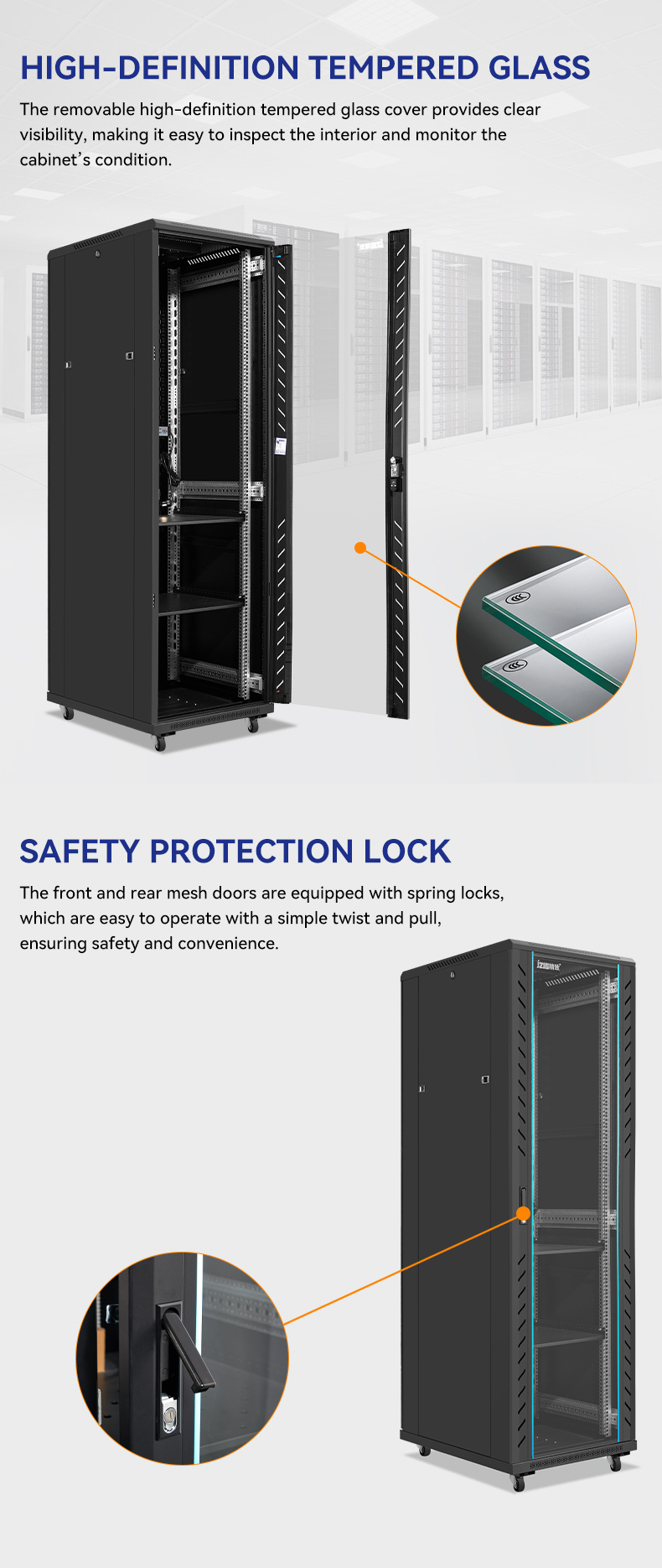 - Network cabinet’s front/rear mesh doors with spring locks, safe & easy to operate