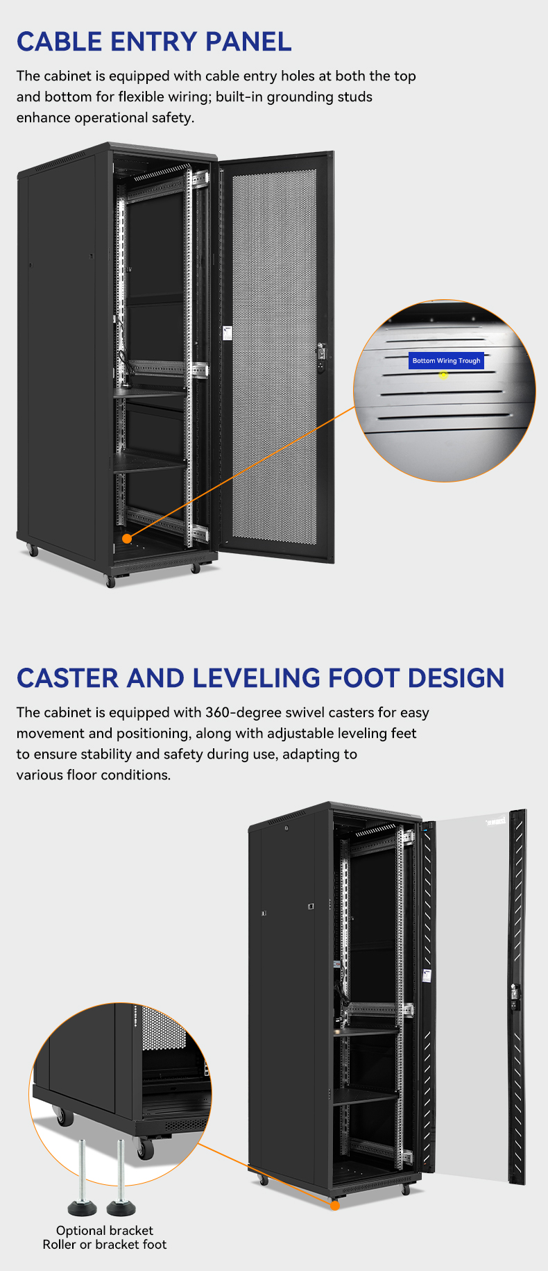 - Network cabinet with 360° swivel casters (easy movement) & adjustable leveling feet (stability)